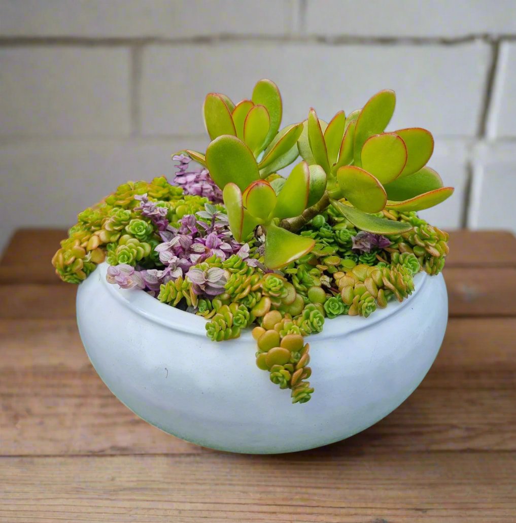 Small round bonsai pot with succulents. 24cm diameter x 9cm depth.