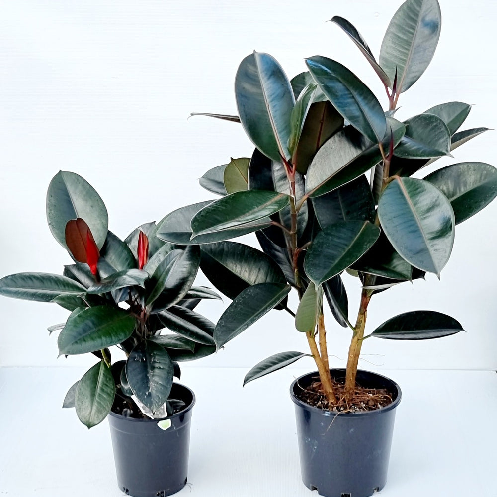 Rubber Plants make fabulous, easy care, household plants. With their beautiful deep green foliage backed by a pink tinge, they can easily make a statement of their own. Rubber plants prefer loads of light but not direct sunlight. Placing by a window with a sheer curtain is an ideal spot for a Rubber Plant. Well draining soil is essential for your Rubber Plant so as not to get root rot. Keep the soil moist during the hotter months but not soggy. During the winter months your Rubber Plant might only require a once monthly water, just watch for when it's leaves start droop and you'll know it needs a drink. Keep their leaves clean by misting often or wiping with a damp cloth and fertilise only during the growing season. These beauties can grow up to 3m high indoors but growth is restricted by the pot size you choose to keep them in.